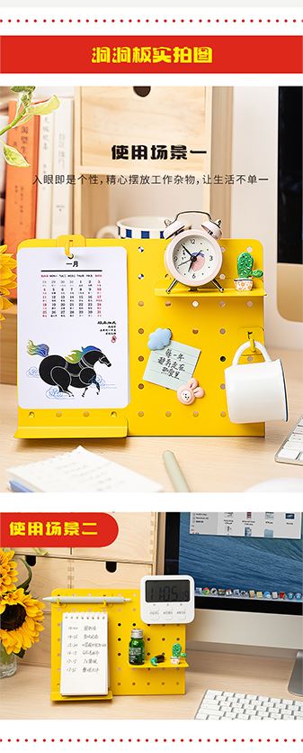 奶黃色桌面洞洞板*1 23cm*18*6.5cm 記事月歷*1 10cm*15cm 13張 免釘小層架*1 7.5cm*4.5cm 包裝盒尺寸: 27.5*23.3*10.5cm